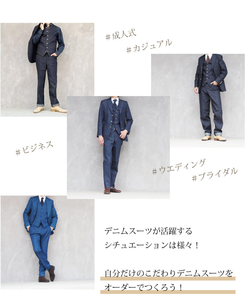 受注会でも、岡山の店舗と同様に、当店スタッフが本格的な採寸を行ってあなたを最高に引き立てるデニムスーツをお仕立ていたします。